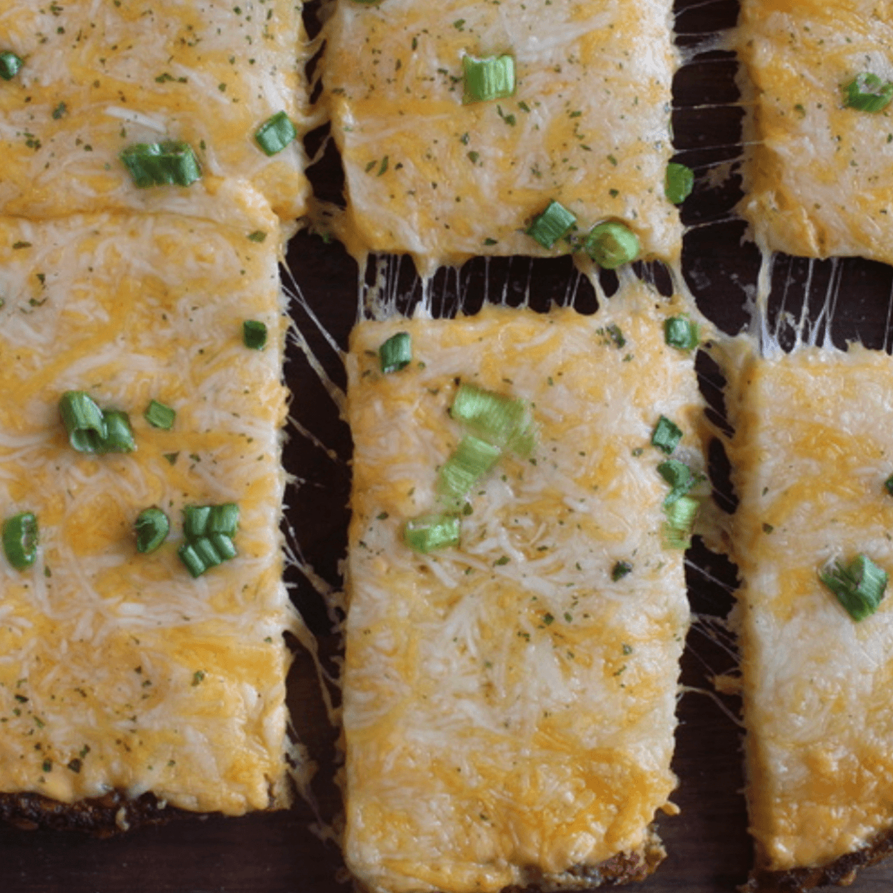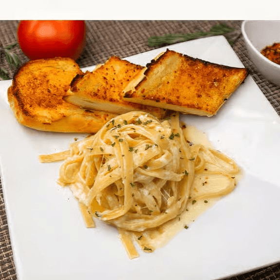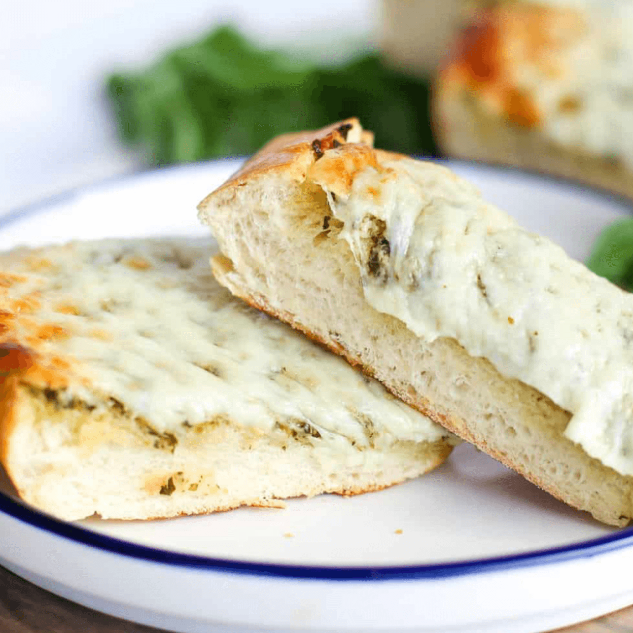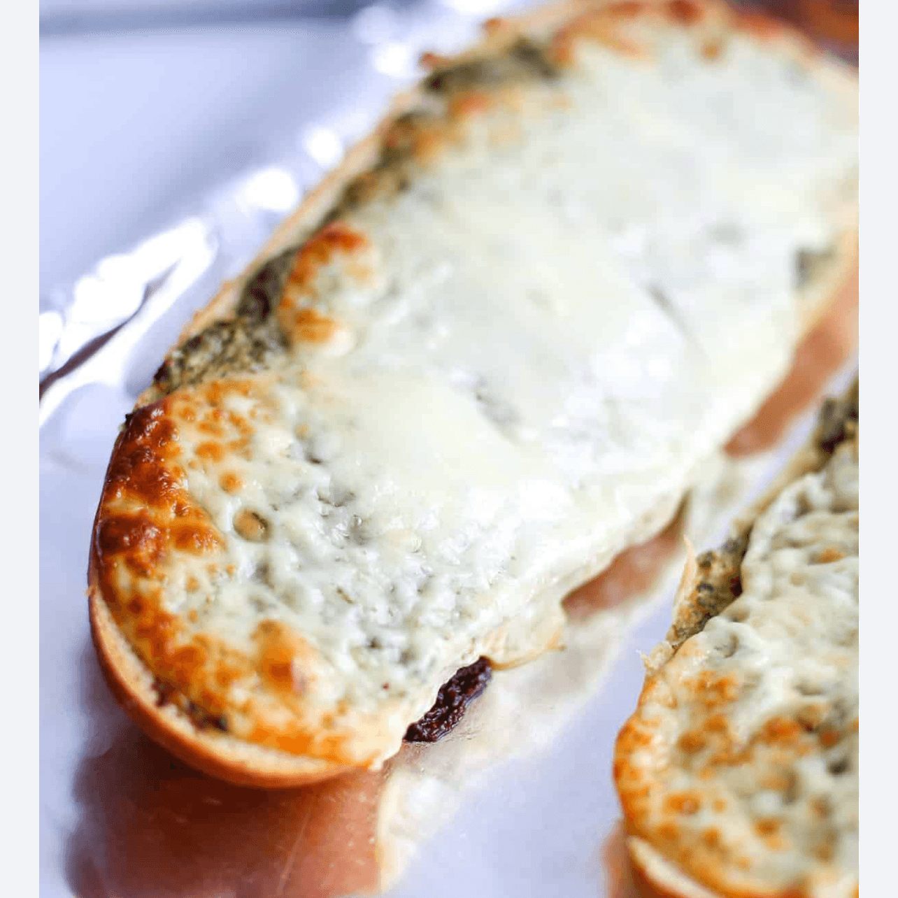 Baked bread generously topped with a blend of pesto and alfredo sauces, finished with melted cheese