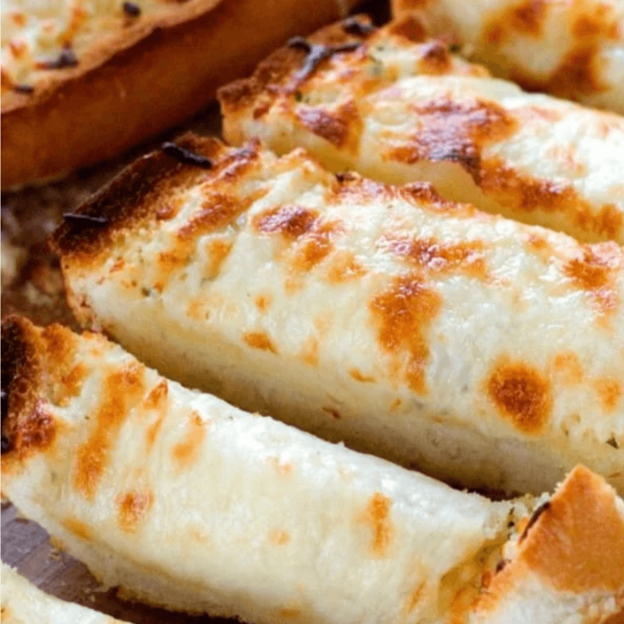 Baked bread generously topped with a blend of melted cheeses, often accompanied by garlic butter