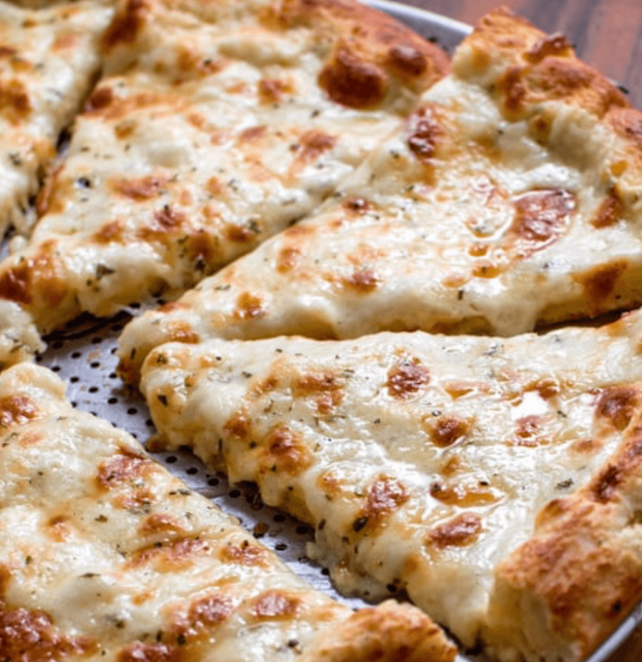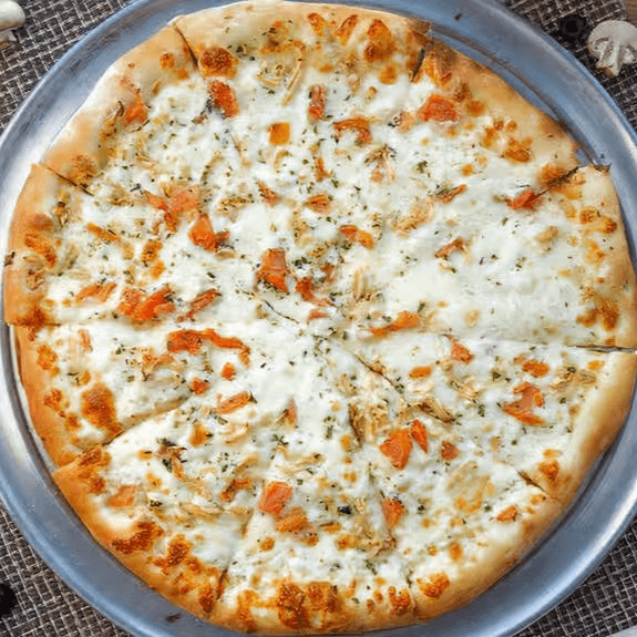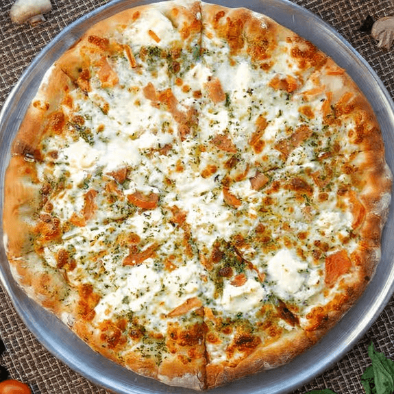 Alfredo, mozzarella with our garlic Romano crust. Try it alfredo pesto style!