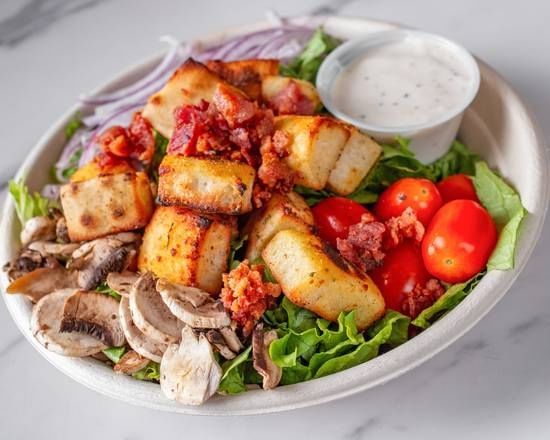 Lettuce, tomatoes, red onions, bacon, mushrooms, croutons, and our parmesan dressing