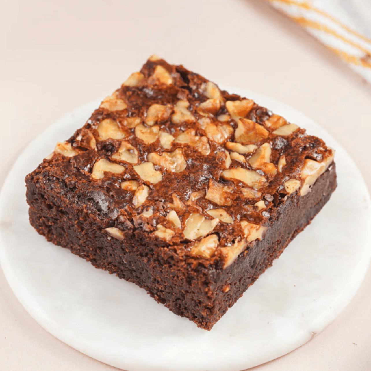 Rich chocolate brownie topped with a generous layer of chopped nuts