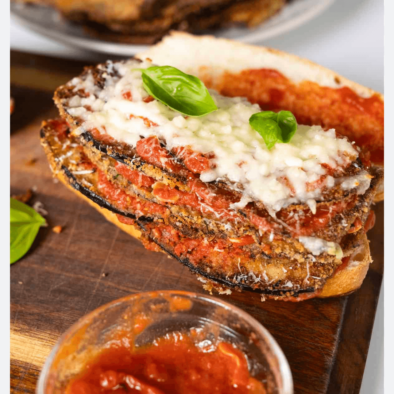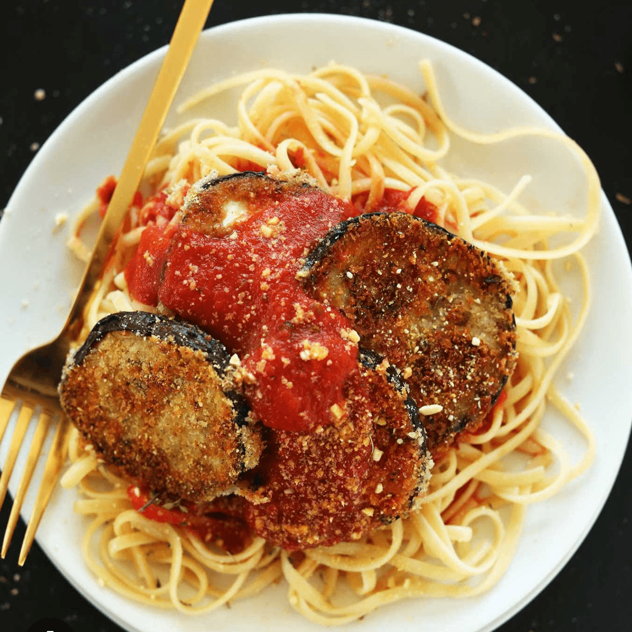 Breaded eggplant with mozzarella and parmesan cheeses and marinara sauce