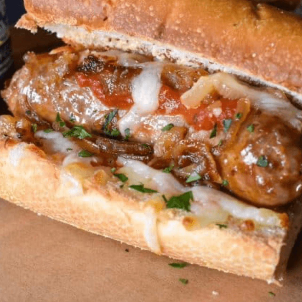 Delicious grilled spicy Italian sausage with onions, green peppers, mushrooms, marinara sauce, and cheese. Try it BBQ style!