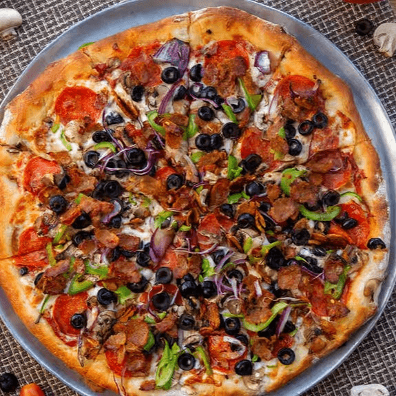 Pepperoni, mushrooms, olives, green peppers, sausage, and red onions