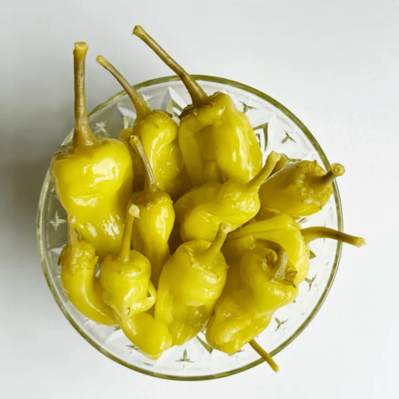 Mildly spicy and tangy pepperoncini peppers, served as a complementary side
