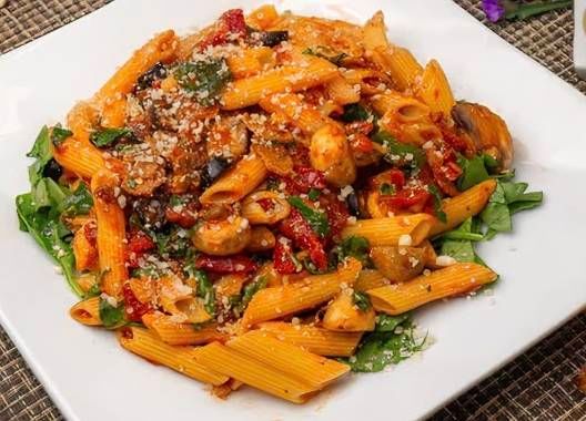 2 or more people. Ziti with fresh mushrooms spinach, black olives, garlic, and sun dried tomatoes. Tossed with parmesan and marinara sauce. Add ground sausage for free! (reg. or spicy)