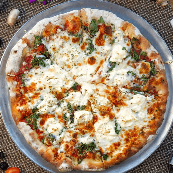 Pizza sauce, fresh spinach, mozzarella & ricotta cheeses, and Italian seasonings