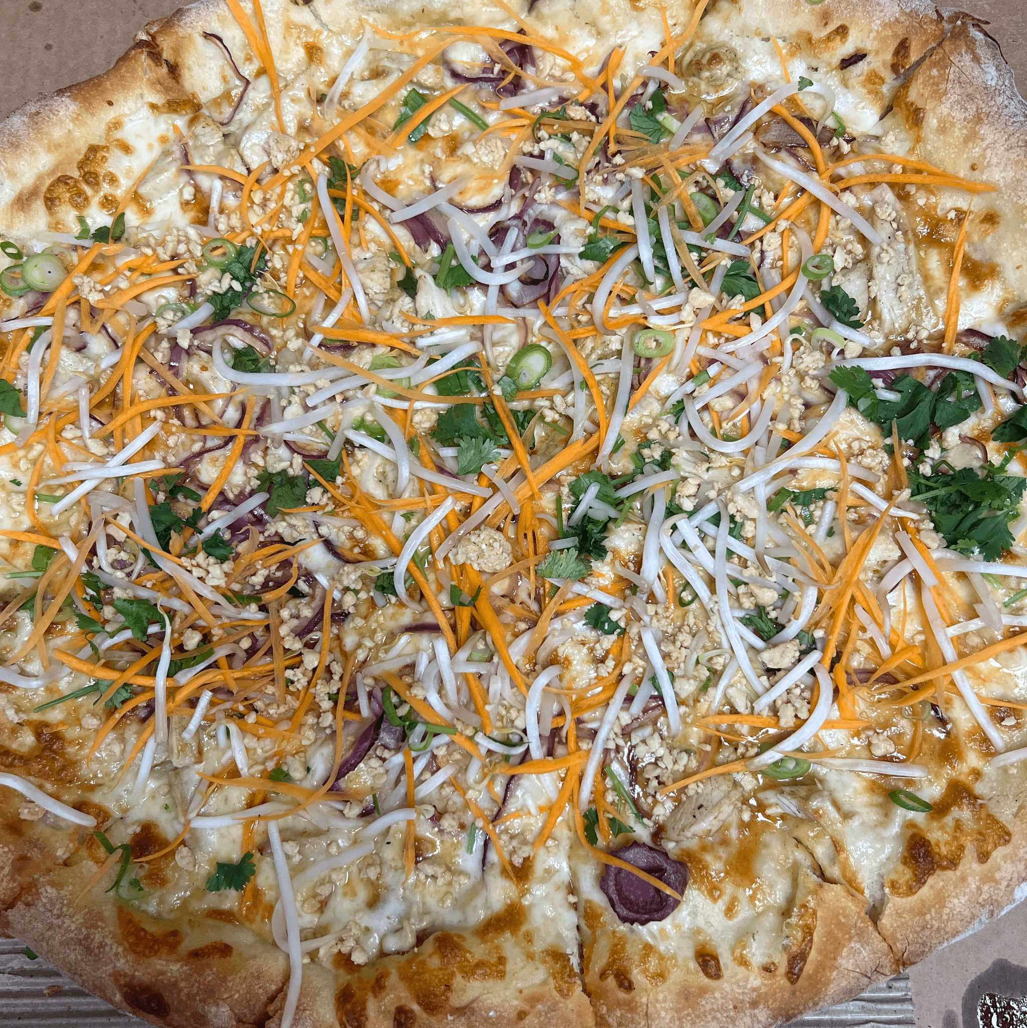 Spicy peanut sauce base topped with grilled chicken, mozzarella, carrots, red onions, and cilantro